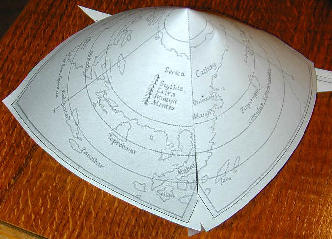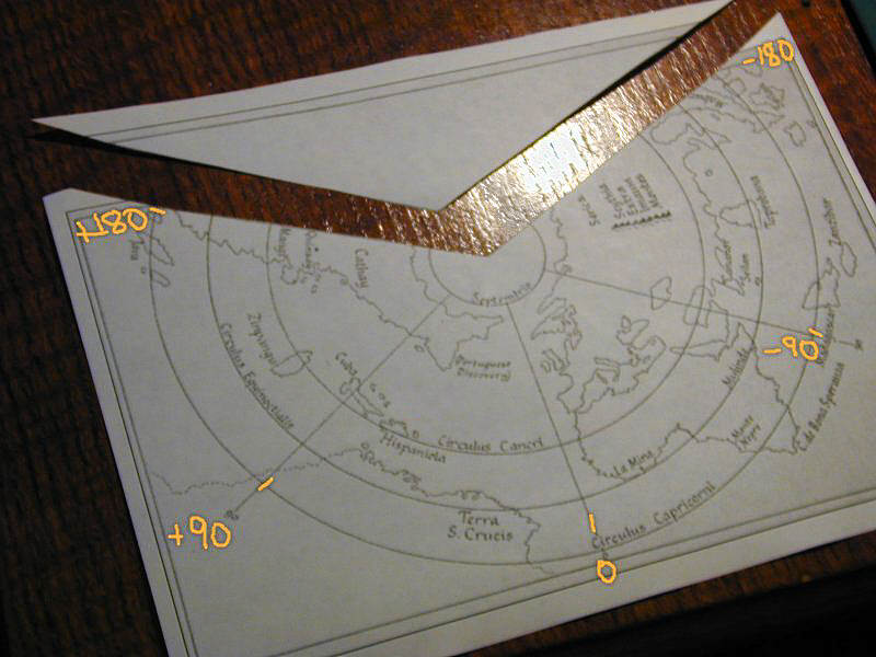 As you can see, the original map is divided into three arcs, each of 120 degrees, with two filled with map data and the third arc containing decorative images rather than oceans / islands.
