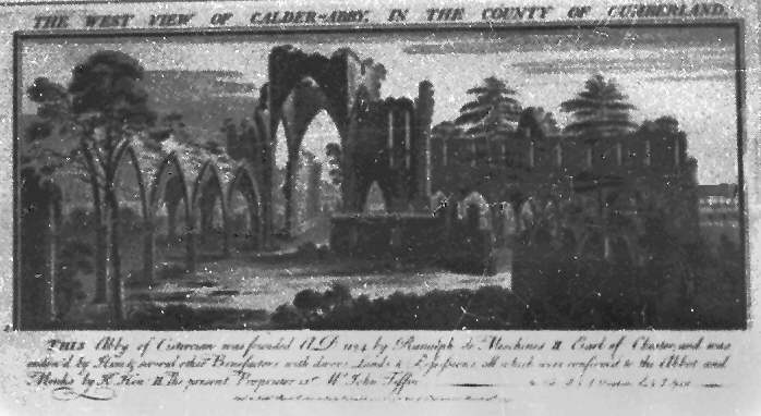 Calder Abbey, Cumbria, UK. Summer c1971. Old print of the Abbey (early 18th century?), hanging in the house.
