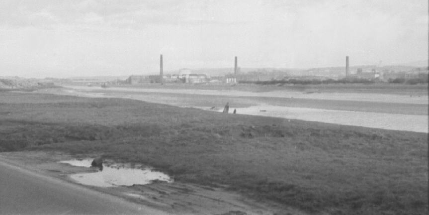 Lune estuary, Lancashire, England. 1975-6. The industrial area west of Lancaster, from Oxcliffe.