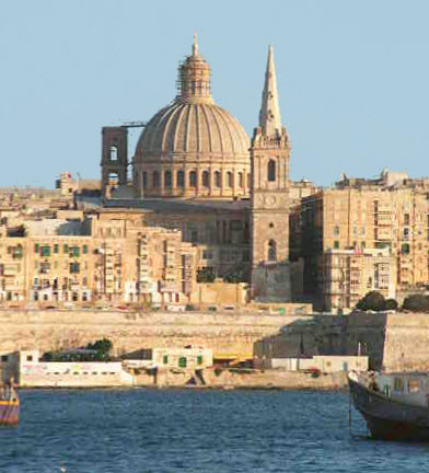Valletta, Malta. Summer 1996. Detail of the view from Sliema, showing the Carmelite church.
